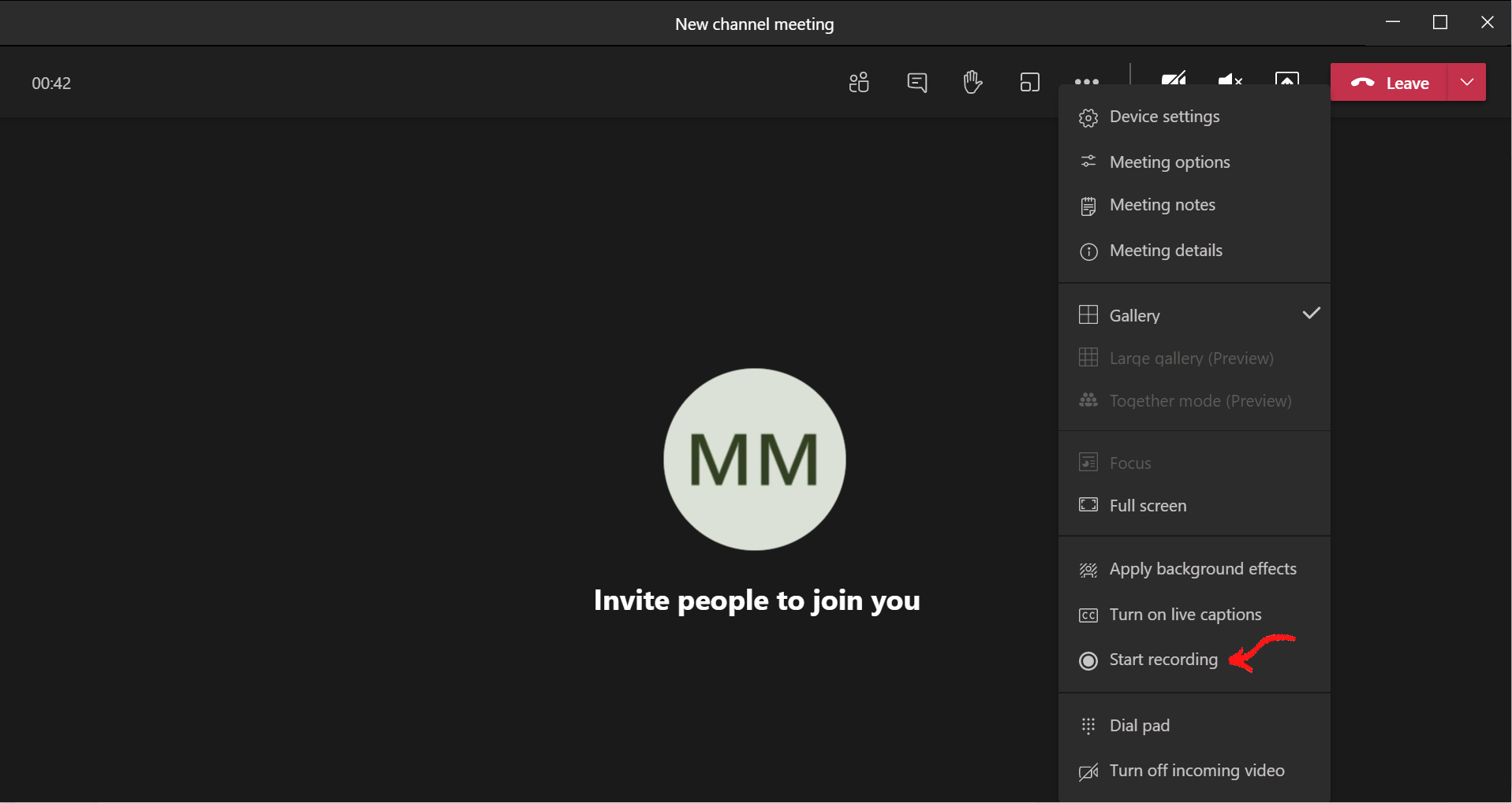 To turn on video recording, while in a meeting, click on More actions > Start recording.