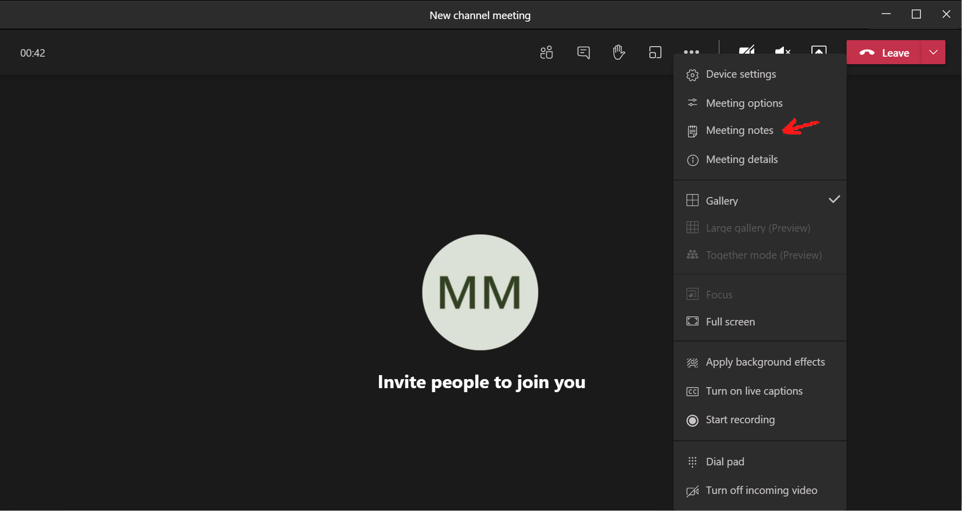 To turn on meeting notes, while in a meeting, click on More actions > Meeting notes.