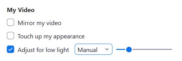 To turn on Zoom’s Adjust for low light setting, click Settings > Video > check Adjust for low light > choose between Auto and Manual mode.