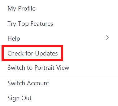 To check for updates, click your Profile icon > Check for Updates.