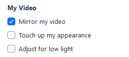 To disable video mirroring, head to Settings > Video > My video > uncheck Mirror my video.