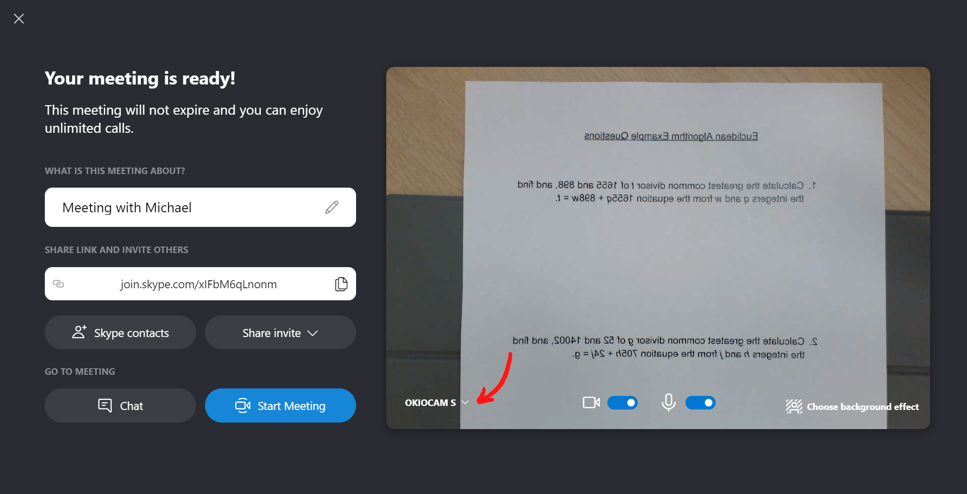 - Before starting the Skype call, ensure that your front-facing webcam is selected as your Camera and not your document camera. If your document is preselected as your Camera, here’s how you can change it: