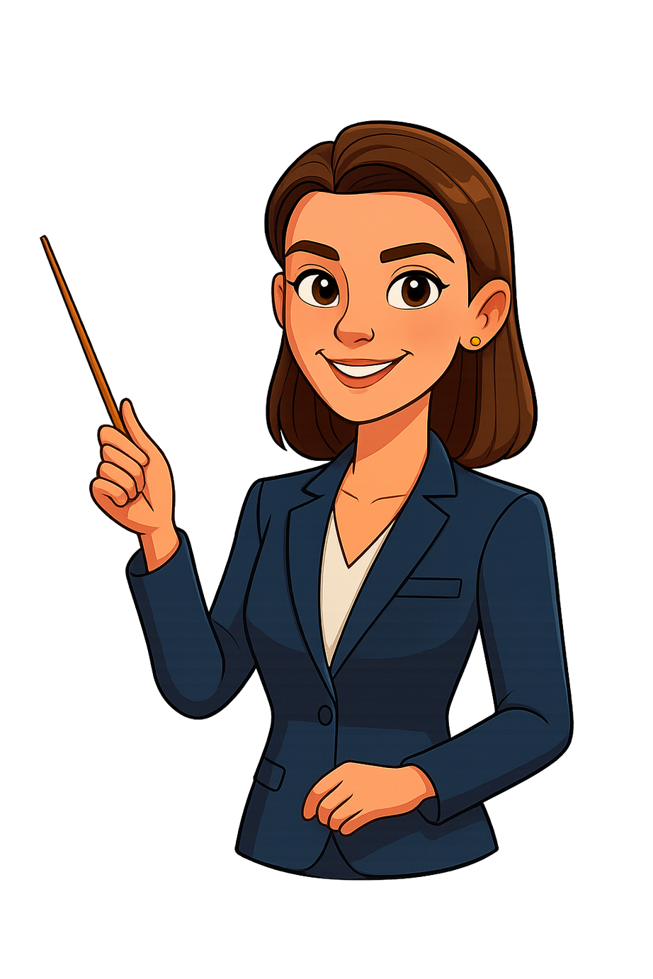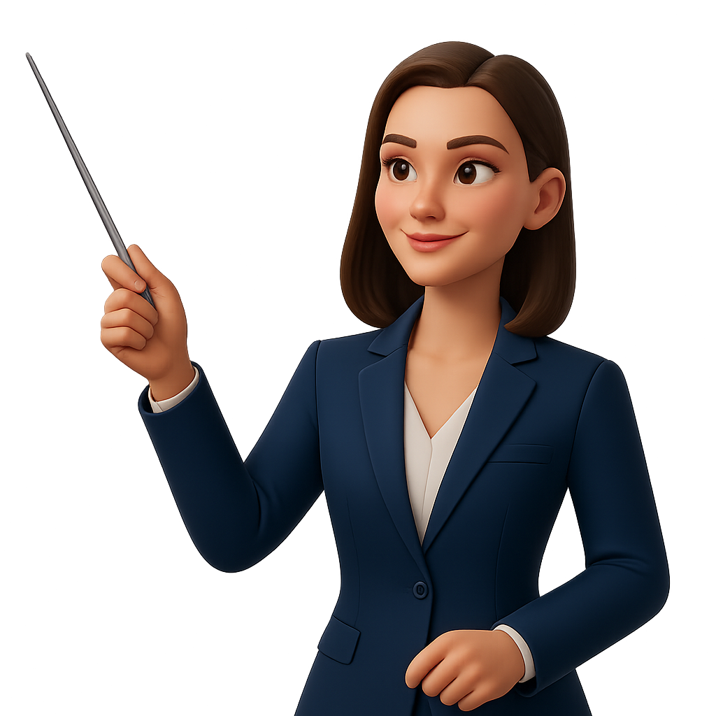pose: half-body (head to waist), confident smile, right hand holding a baton, pointing to the view's top left