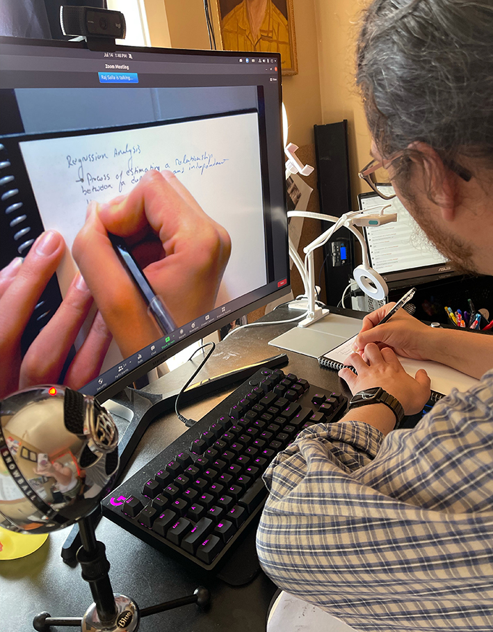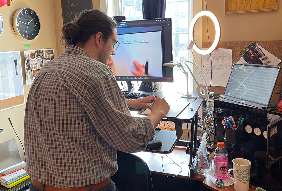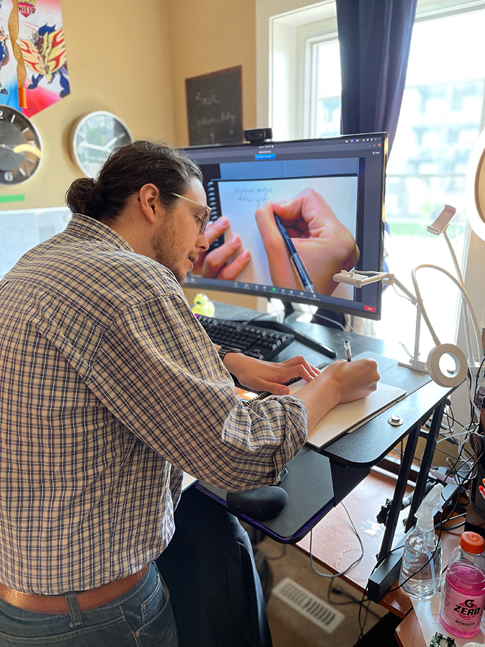 For someone who has such a high level of knowledge of tech hardware, Trevor likes to keep his technology tools minimal and on the safe side of a 404 error by sticking with the traditional methods of a whiteboard and document camera, although he admits to using Discord, a private chat room server, for uploading and sharing lesson material with his students.