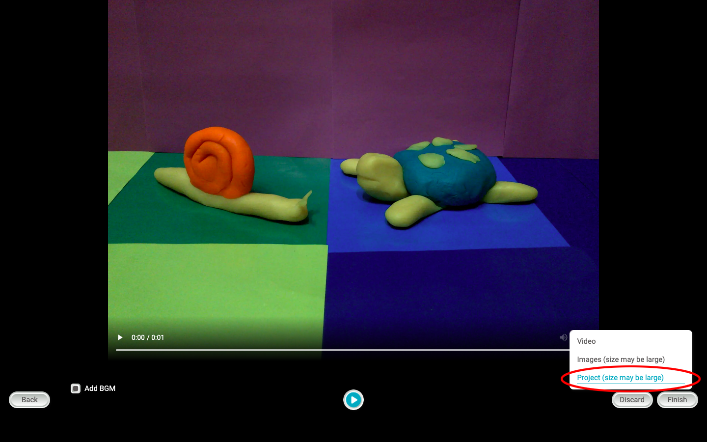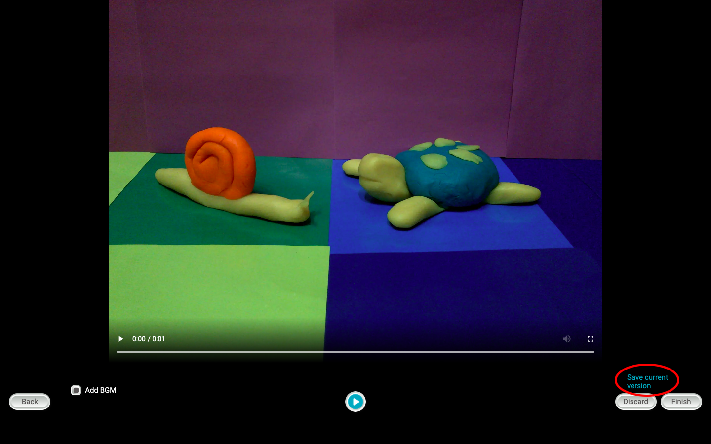 • To save your project in the next screen, you must click on the blue text that reads ‘Save current version’. Note: By pressing the gray ‘Finish’ button, your project will convert to a video file and you will not be able to import the file back into the OKIOCAM Stop-Motion app. Only use the ‘Finish’ button when you have finished your project completely. See example 3.