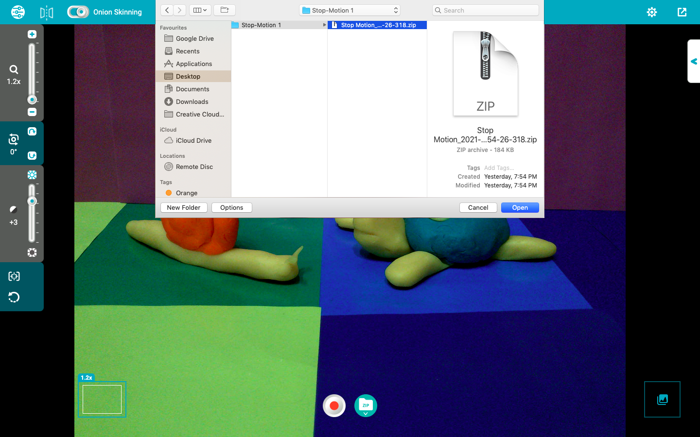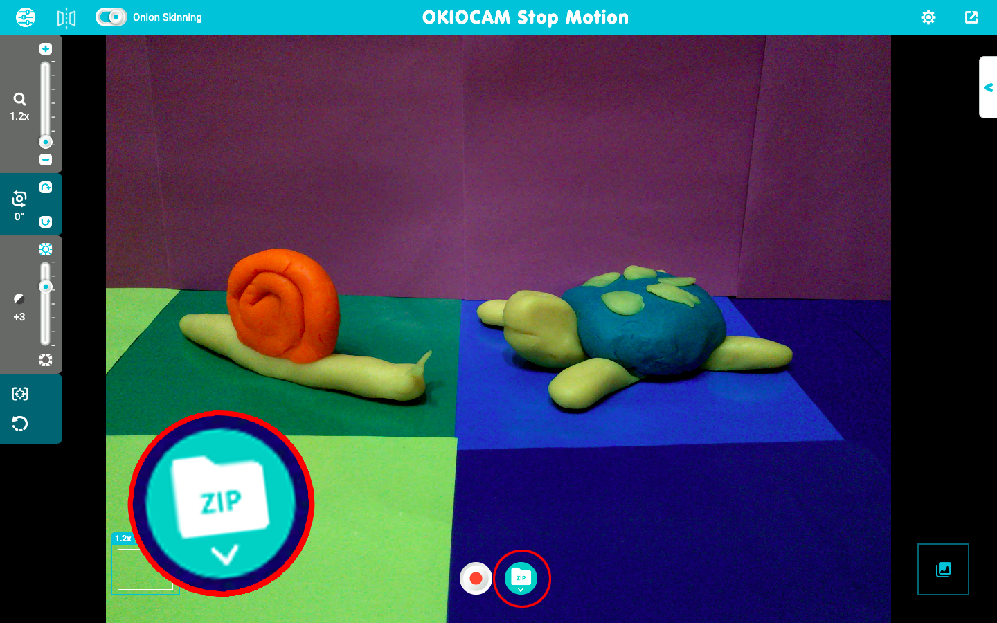 • To re-upload your project, simply open the OKIOCAM Stop-Motion app and select the blue ‘ZIP’ button on the right at the center-bottom of your screen. Select your project and you can carry on completing your animation work of art. See example 6 & 7.