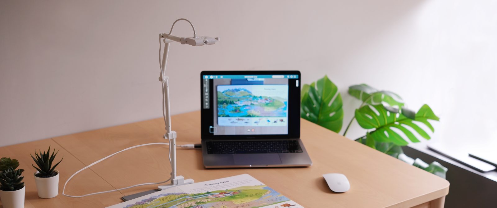 This document camera offers the capability to view full ledger-size (A3) materials in landscape orientation, making it suitable for displaying large maps, artworks, or both pages of an open textbook within a single frame. It offers the broadest view available on the market, similar to our own OKIOCAM W1 document camera, while being much more compact in size for users who need a flexible camera on the go.