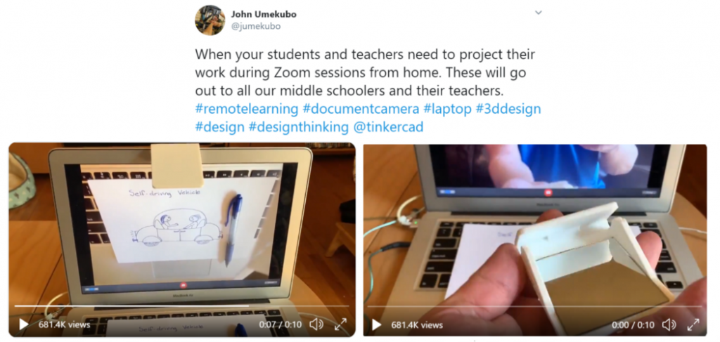 John has taken homemade doc cams to the next level! He designed his very own doc cam using the free 3D modeling program Tinkercad. Absolutely mind-blowingly cool, John! He even wrote a blog post on his document camera. You can find here.