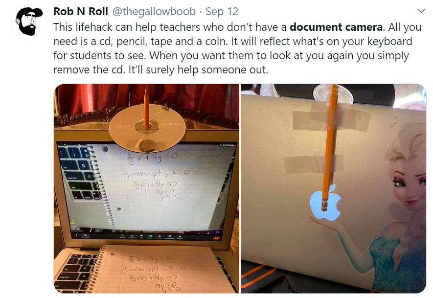 One of the ways it was most observable was in their ingenuity and resourcefulness. Everyone knows that teaching remotely is no easy task. It is even more of a challenge when you don’t have one of the essential tools of remote teaching — a document camera. Document cameras, like many other items, are proving tough to source during the pandemic. Not to be beaten, though, hosts of teachers quickly devised an abundance of creative solutions. A bunch of them shared ideas on Twitter. Check ’em out below!