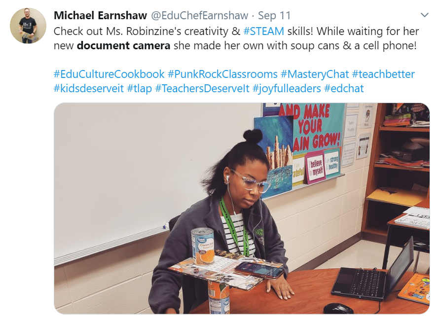 Ms. Robinzine used just a couple of cans of soup and her cell phone to make an incredibly simple doc cam. Super cool idea! Although I hope your new document camera arrives soon because your phone looks to be balancing a touch precariously!
