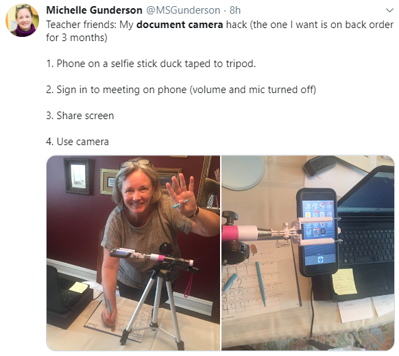 This makeshift doc cam idea that Michelle shared using a cell phone, tripod, and a selfie stick looks super sturdy! I bet your students really benefit from it, Michelle! Fingers crossed you’re able to get your hands on the document camera of your dreams soon enough.