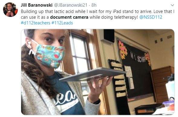 What if you’ve got no equipment lying around the house to fashion into a doc cam? Grab your iPad and just hold it up like Jill! What’s better than teaching remotely and getting a workout in at the same time?