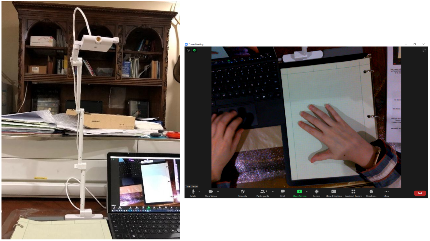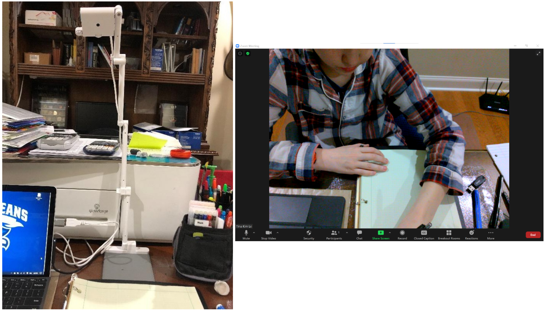 During Zoom class lectures, our teacher often asks us to work on a problem and then share our completed work with our classmates. With conventional front-facing webcams, this is a challenge because it is awkward to share your work by holding your notebook up while making sure it is readable. However, I can easily share my work, without any issues, by using the adjustable arm on my OKIOCAM to change the camera from showing my face to showing my work, as shown in the pictures below. Also, I can show my face with my front-facing webcam and use screen sharing to show my work using the OKIOCAM.