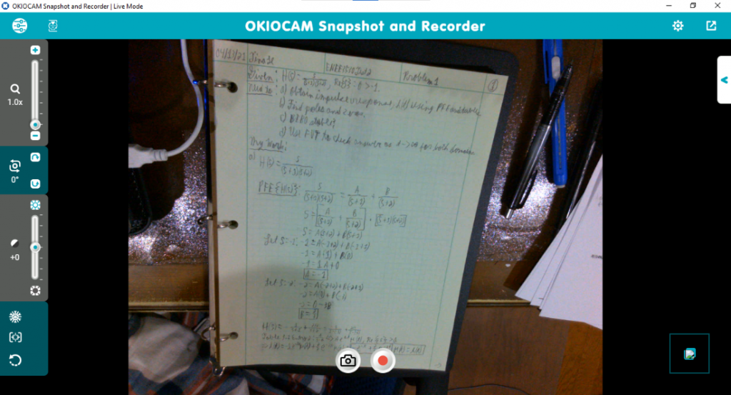 For online assignments, our teacher requires us to submit digital copies of our completed work by scanning the pages or using our phone to take pictures of them and then uploading a single file containing all the digitized pages. Using a scanner or phone to digitize your written work can lead to pages with work that is skewed, cut off, or illegible. However, I can use my OKIOCAM with OKIOCAM Snapshot and Recorder to take pictures of my work, as shown below.